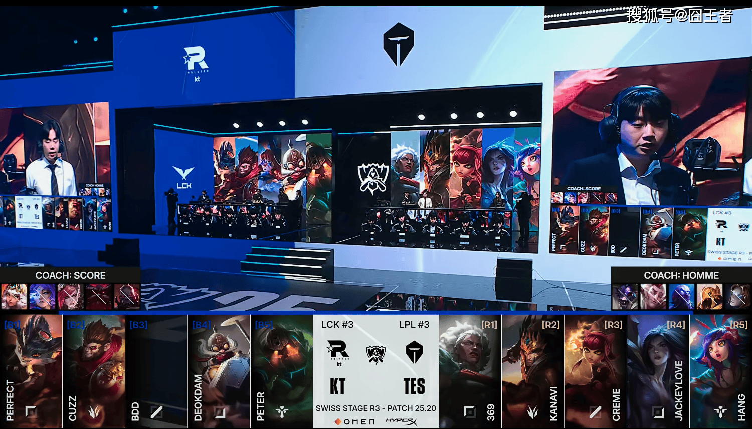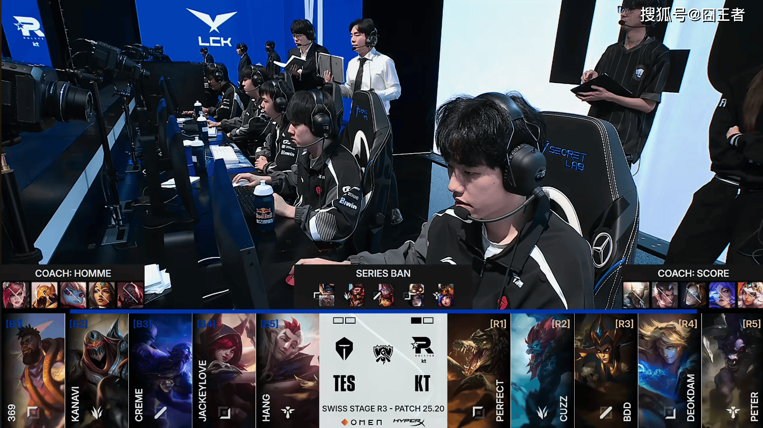 第一局比赛,KT蓝色方,禁用:奇亚娜、芸阿娜、蔚、奥恩、赛恩,选用:PerfecT兰博、Cuzz猴子、Bdd阿萝拉、Deokdam飞机、Peter泰坦;TES红色方,禁用:发条、沙皇、瑞兹、洛、牛头,选用:369安蓓萨、Kanavi皇子、Creme安妮、JackeyLove卡莎、Hang妮蔻