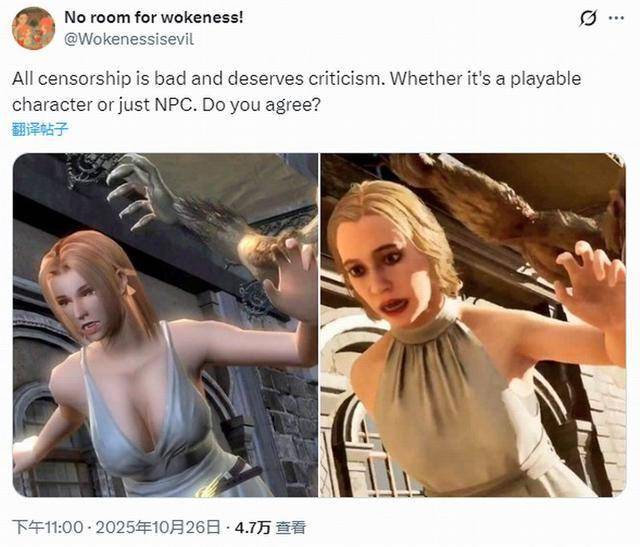 从图中可以看到,重制版中该角色的服装覆盖了原版的暴露皮肤。他表示:“所有审查都是糟糕的,应该受到批评。无论是对可玩角色还是NPC,都不该审查。你们同意吗?”