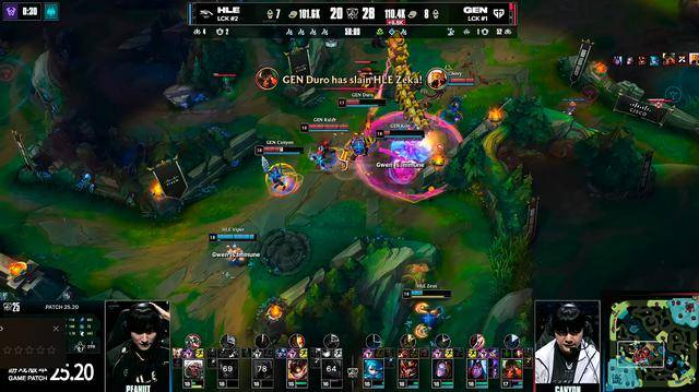 HLE前期的换线联动,直接将Kiin剑魔抓死,随后Zeka岩雀六级之后,直接开大来到上路抓死Duro妮蔻。Chovy瑞兹在打完巢虫之后,来到上路将Zeka岩雀击杀。峡谷先锋刷新,HLE率先落位并且野辅先手没能打掉Canyon的猴子,GEN接手先锋成功拿下,GEN选择直接跟HLE打团,Kiin剑魔进场无人可当,GEN打出0换3大获全胜。