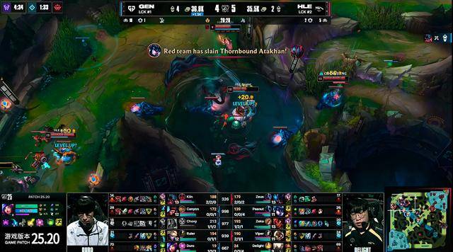 前期6分钟小龙争夺,HLE率先落位,GEN虽然也赶到,但他们这个时间点没有伤害,被HLE追着打并拿下小龙。随后巢虫团,GEN将小花生与Delight击杀,人头让Ruler拿到,GEN控下三条虫子。15分钟先锋刷新,GEN拿到先锋双方战成一团,HLE打出1换4。