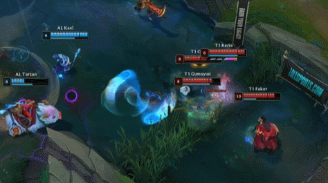 开局对线阶段T1下路换血成功取得较大线权优势,Tarzan选择提前Gank下路,但T1选择反身硬换击杀辅助双方打出一换一,上中两路对线T1均取得线权优势。