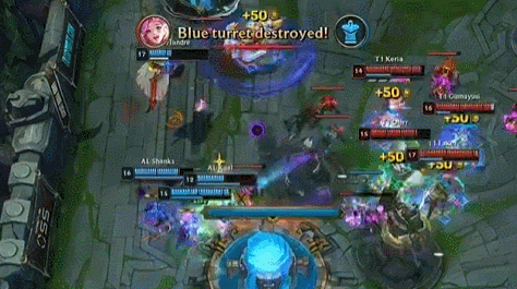 逆转局势后AL连续利用金克丝大招和救赎打断鳄鱼回城,随后尝试越塔鳄鱼,T1救赎保护,AL选择后撤后直接放掉先锋帮助金克丝拆掉一血塔。