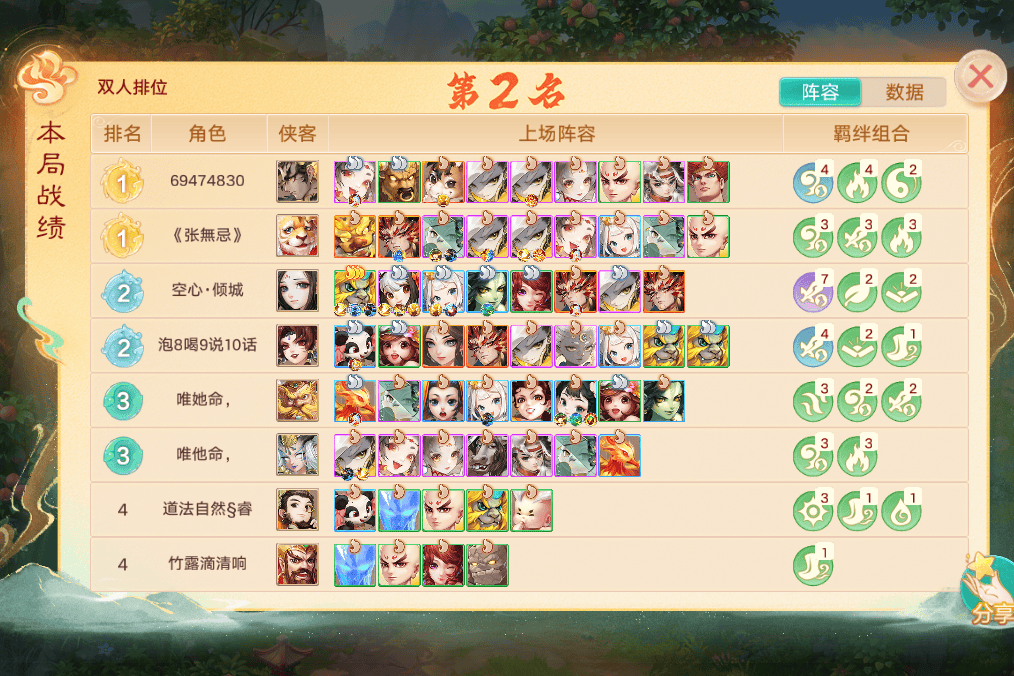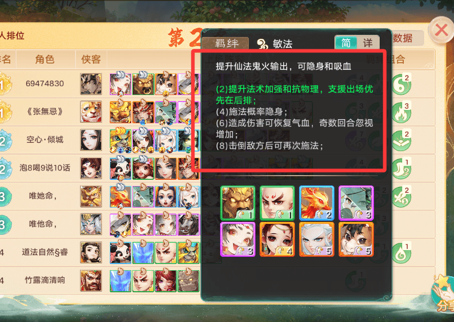 可以看到在前期敏法流先手压制极强,一直都是连胜状态,叶子猪基本上都是排名第一,远超第二名敏法流张无忌,无奈队友太坑,在后期直接把我拖到了第二名。