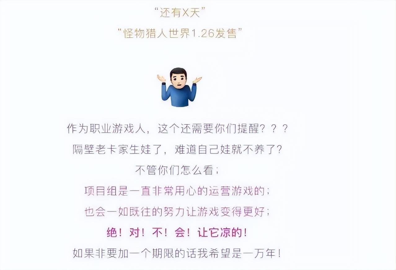 为了稳住玩家,《怪物猎人OL》项目组在公众号发文,表示了将游戏运营到底的决心。