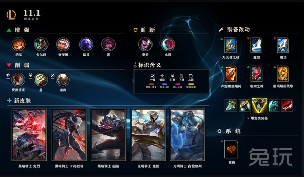 除了版本英雄、装备与物品、重伤效果、生命偷取清晰化、游戏内聊天系统/装备商店更新、极地大乱斗平衡性更新、Bug修复及品质级改动,7项游戏内容进行了改动与优化之外,即将到来的光明骑士&黑暗骑士系列皮肤与炫彩也已在11.1版本内。