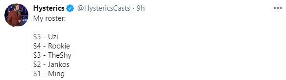 第二位是LPL英文流解说Hysterics,他的选择是Uzi-Rookie-TheShy-Jankos-Ming。与莫凯西不同的是,Hysterics选择的阵容正好十五美元。当然对比两者的阵容,不难看出下路已经是定了“Uzi+Ming”,而其他位置多多少少有点争议。