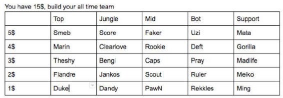 这个表格中都是各个赛区非常有名的选手,当然我们选择选手也不能直接挑最贵的选择,因为5个位置如果选手身价都是5美元,那么我们的预算会不够,所以如何利用有限的资源,组建最强的战队,才是这个挑战的重中之重。