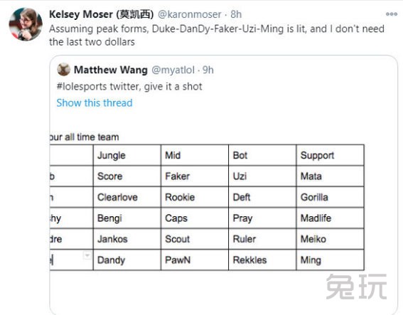 相信大家都已经有了自己的打算,不过我们先来看看别人的选择。第一位是海外知名分析师莫凯西,她表示:“如果是全部巅峰,我会选Duke-DanDy-Faker-Uzi-Ming,剩下的两美元我不要了”