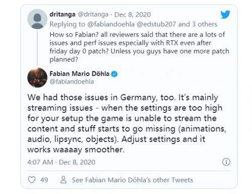 Döhla还解释了《赛博朋克2077》中出现的一些问题,是因为画质设定太高,导致游戏无法传流内容,一些东西(动画、声音、嘴型、物体等)缺失。如果玩家调整下设置,就能解决嘴型不一致,物体缺失等问题。