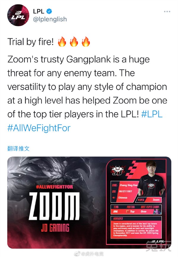 Zoom值得信赖的普朗克对任何队伍都是巨大的威胁。高水平发挥各种风格英雄的多功能性使Zoom成为LPL的顶级选手之一。”