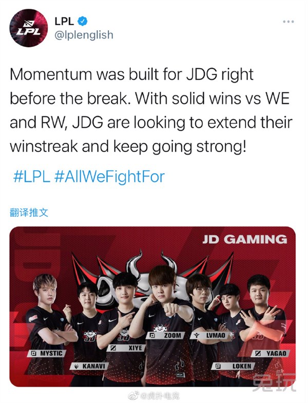 “JDG在休赛期前创造了动力。在取得与WE和RW的比赛胜利的同时,JDG希望扩大他们的胜利,并继续保持强势!”