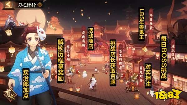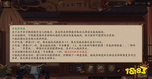 *活动期间,消耗体力或'平安餐券'可选择指定式神店长发起挑战,战斗胜利可获得'百鬼料理拼盘'及对应资源奖励。