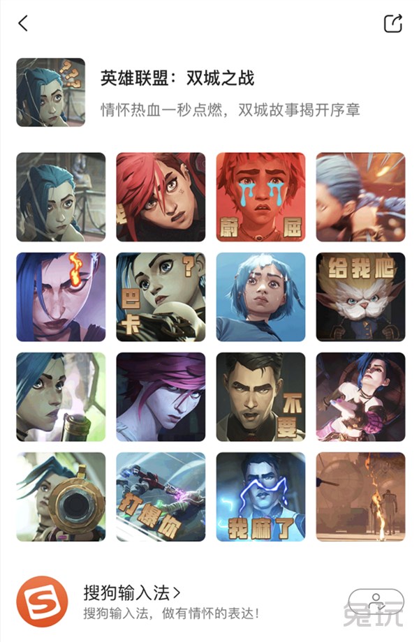有了趁手的输入法皮肤,没有逗趣表情包的聊天能叫聊天吗?除了专属皮肤更新以外,《英雄联盟:双城之战》和搜狗输入法还贴心地为大家奉上了动画角色的专属表情。一发“金克丝爱的泡泡”,让大家传情达意更生动有趣。