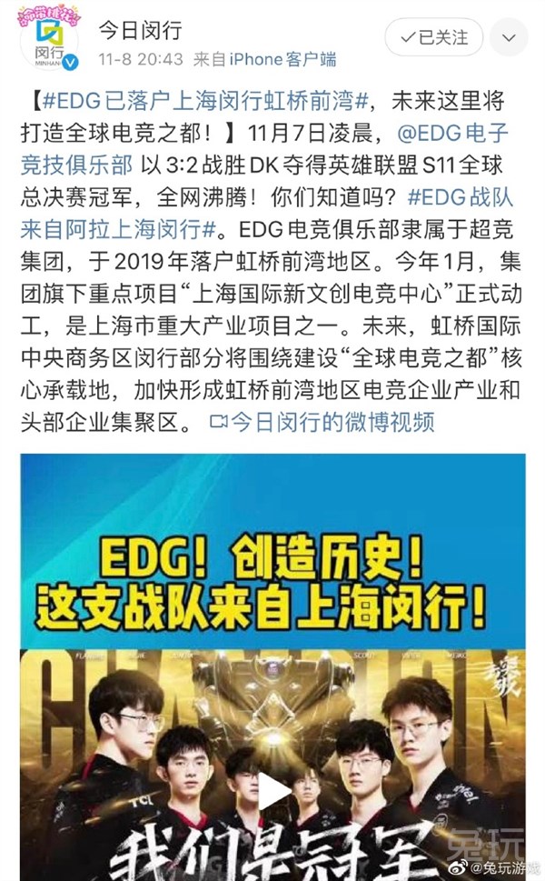 EDG电竞俱乐部隶属于超竞集团,于2019年落户虹桥前湾地区。今年1月,集团旗下重点项目“上海国际新文创电竞中心”正式动工,是上海市重大产业项目之一。