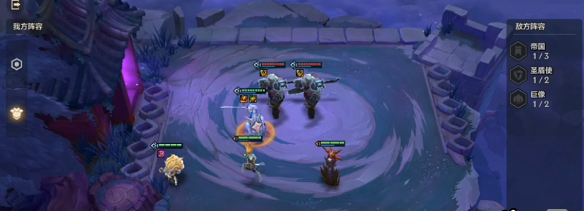 装备合成:狂徒、无尽、正义之拳、基克的先驱,然后将狂徒给日女,无尽和正义之拳及基克的先驱给小丑,主要靠小丑来主C,日女来抗伤害,站位如下图所示。