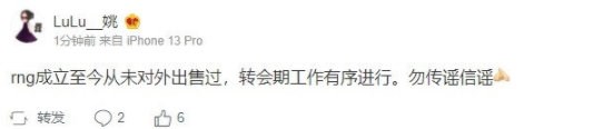 RNG管理层LuLu姚(RNG老板的姐姐)更博,并表示道:“RNG成立至今从未对外出售过,转会期工作有序进行,勿传谣言谣。”