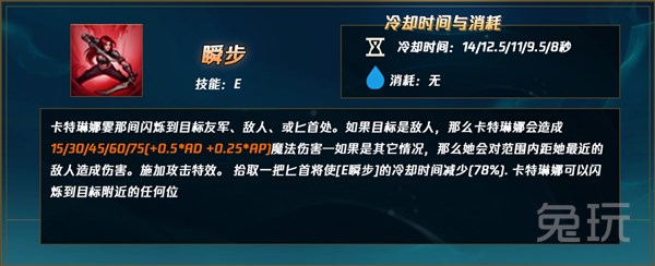 卡特的位移在说明上是标准了瞬移,极快的位移速度和看不懂的位移距离,使得猛然冲击带来的穿透效果格外明显,对于前期堆法强和吸血的我们而言,无疑是最好的选择。