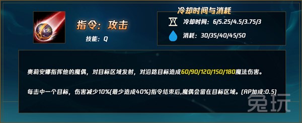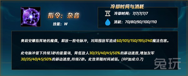 发条调整球的位置的技能,是发条的主力输出技能,也是一个发条玩的好坏的评判标准,前期可以使用Q技能推线补刀,消耗对手,q的位置尽量与敌人靠近一些保证自己能够稳定命中以及不容易被躲掉。探草丛时可以先用q技能将球放入草丛,球也会提供一个眼的视野,可以知道有没有敌人存在。在团战开启前,可以先将球的位置放到面前比较远的位置自己离球远一些可以保证自身输出的同时不会离前排过近导致走位失误被控。在打龙团或野区团时,可以先用Q技能将球卡在敌方的入口处,可以有效对敌方进行aoe输出,限制敌方进场。