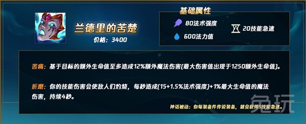 兰德里的苦楚:敌方战士型英雄较多或坦度较高时的首选,面具提供的额外伤害和灼烧伤害对于生命值较高的目标来说是非常痛的,打击力度很足,而且灼烧伤害可以收割残血目标,但是由于星界驱驰可以说必出,星界驱驰就可以提供大量减cd,面具的神话被动就不是很有用了,如果主系符文选择艾黎路线,则需要卢登的加速,所以目前不是很推荐出面具了。
