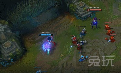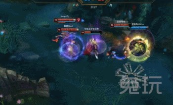 例如被战士类英雄贴身时,可以利用大招将敌方英雄拉到一侧后往另一侧反向走位争取拉扯空间,等待队友支援或自己利用w的加速和走位操作。