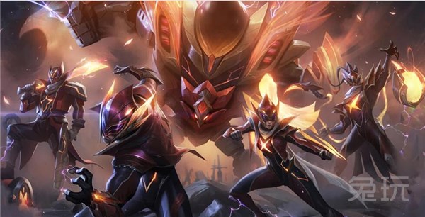 每一位冠军皮肤都以黑白蓝三色为基调,身批龙鳞甲,并不是传统的中世纪骑士的风格。很好的结合骑士与潮流的两个主题。构图方面五位英雄站在台阶上,背后是一条若隐若现的东方神龙。构图有一点瑕疵,那就是五位英雄的站位都比较散,没有形成帅气的合影。这也是冠军皮肤的限制,既要让英雄们合影,又不能靠的太近,不然皮肤单独看就很乱。所以像S8IG的皮肤直接把六个英雄拆开了。