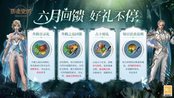 六月回馈,好礼送不停!升腾之战活动期间,登陆游戏可得觉醒果实、折扣券等福利道具,每日消耗体力还可兑换遗迹宝图残页等更多好礼。参与占卜赠礼完成占卜任务,非凡特性、全能刻刃等道具免费得。每日消费魂晶达到指定档位将获得精美礼品,福利多多,等你来拿!更有全新带翻滚礼装“冥蝶之章”、沙盘全新赛季“升腾之战”重磅登场,海量福利活动不可错过!