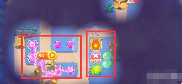 1、首先我们开局升级场上的魔法球,瓶子炮锁定上方小草,有钱升满级。