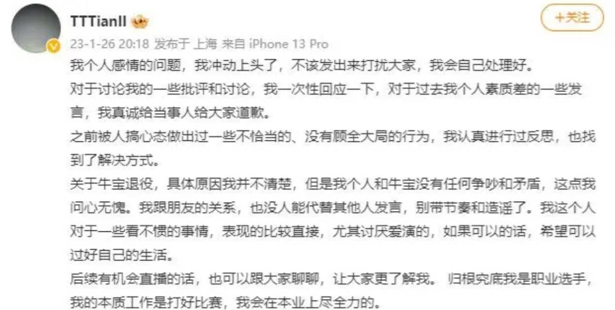 而小天自己主动反击Doinb的内容,也做了一系列的道歉,他澄清自己和Nuguri不存在矛盾和争吵,然后为自己素质差道歉,另外他提到:之前被人搞心态之后做出过一些不恰当的,没有顾全大局的行为,关于这个事情他认真做过反思,也找到了解决方式。