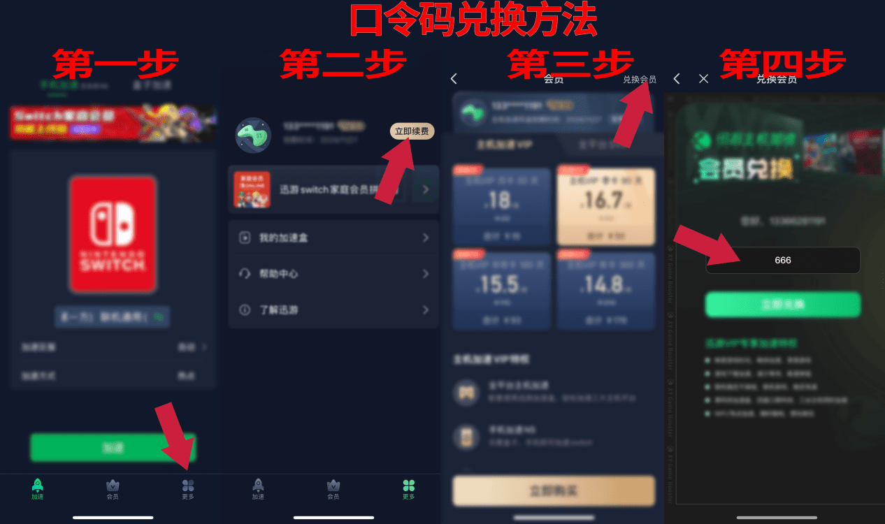 如果小伙伴们想提前去练习一下宝可梦的各个阵容,又苦于网速不够优秀,那么可以使用迅游主机加速器只需要输入口令,就可以领取免费的加速时长,这里第一步点击右下角的“更多”,之后第二步点击右上角的“续费”,第三部点击兑换会员,第四部输入口令,就可以快速领取拉。行动不如行动,不妨去试试吧!