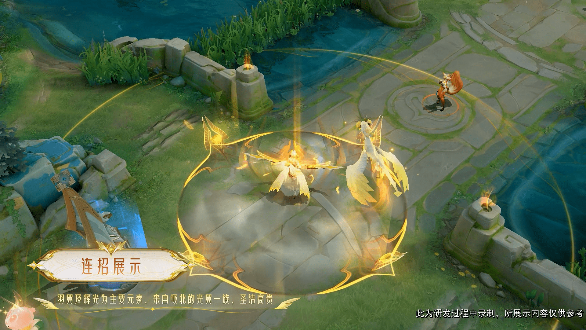 技能展示:特效中融入了辉光、翼龙、羽翼、龙炎等元素,契合伽罗新皮肤的光翼之龙主题。