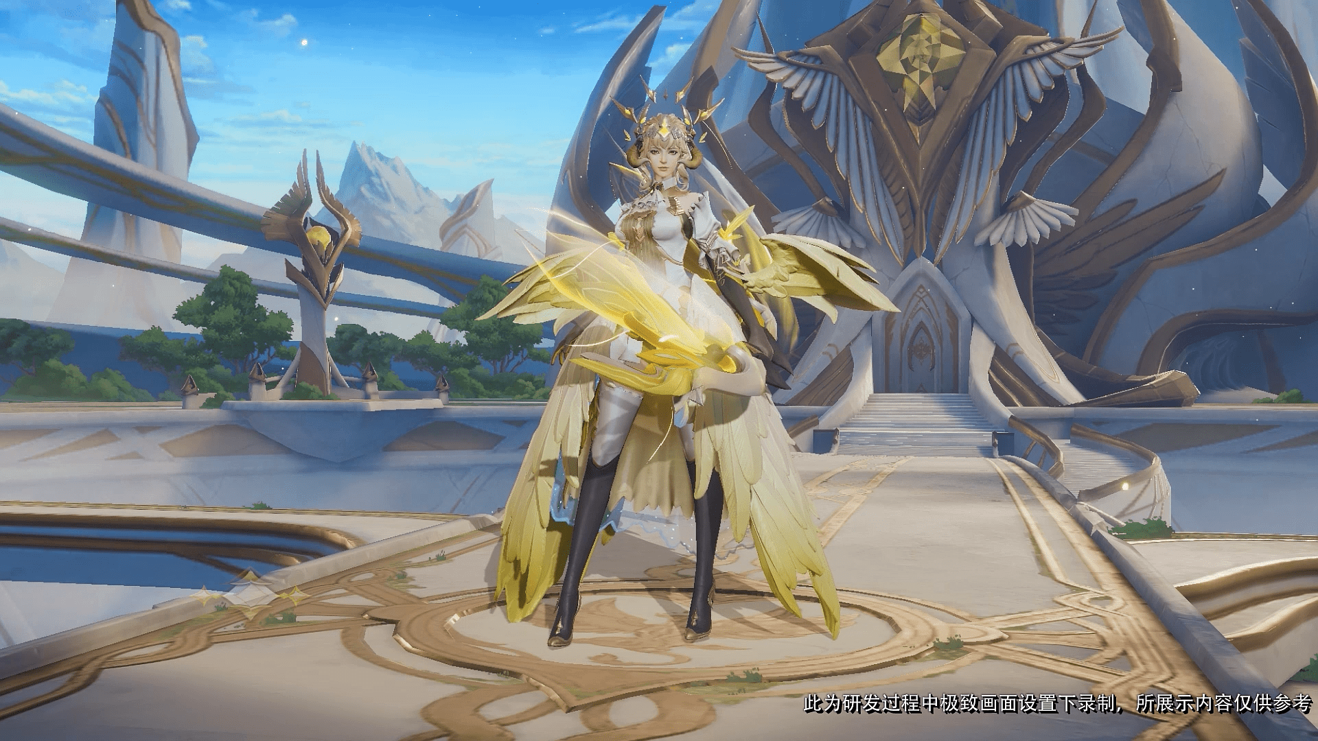 模型展示:伽罗化身光翼一族的少女,身穿金白双色礼服,搭配羽翼点缀,武器上更是有辉光和金色线条流动,更显圣洁和高贵。