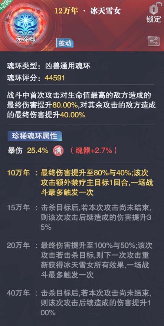那么雪女也是几乎所有的主C都可以佩戴的魂环,不过其增伤的幅度肯定没有之前提到的【冰碧】那般夸张,同时考虑到目前短图战斗也不是非常困难,因此【雪女】眼下最大的表演场地可能还是极限战境玩法,效果还算是非常优秀的,但就是适用场景稍显局限。