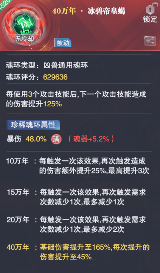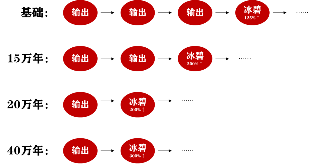 此魂环的基础增伤逻辑我们用下面的图示来表达大家就应该非常清楚了,反正简而言之就是,基础效果每打3次后才能出冰碧的125%增伤,15万年最少打2次后即可触发冰碧的200%增伤,20万年最少打1次后就能触发冰碧的200%增伤,40万年则是最少打1次后就能触发冰碧的300%增伤,相当于直接提升到原伤害的4倍。