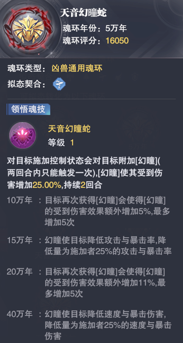 接着第三个我们看到的是【天音幻瞳蛇】这枚控制系的RMB魂环,上线时间为2022年的7月周年庆活动期间。这个魂环需要以施加控制状态为触发前提,且2回合只能生效一次【幻瞳】buff,虽然看似在长图和PVP中都可以携带,但其适应目前控制系魂师的能力却并不强,例如SP比比东、SP波赛西在长图中基本上就不太可能去携带【天音幻瞳蛇】。