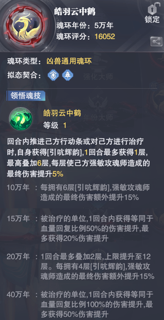 理论上来讲,1个【皓羽云中鹤】的理论增伤上限为(这里不考虑15万年和40万年的治疗回复效果):基础效果对应30%,10万年对应45%,20万年对应105%。如果要损伤15万年和40万年的回血增伤效果,其效果还会更加夸张,大家注意这里所提到的是强、敏攻系魂师的最终伤害,所以理论上这个魂环的增伤能力还是非常可观的,但其难点则是在于现在也只上线过2次,所以对于绝大部分的朋友而言,虽然其触发效果的门槛并不高,但想要积累年限的难度却很高,后续我们慢慢努力去攒攒吧......