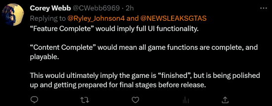 随后有玩家对此进行了补充说明,指出“功能完整”意味着完全的Ul功能,“内容完整”意味着所有游戏功能都是完整的,并且是可玩的。这表示游戏已经“开发完成”,但正在为发行前的最后阶段进行润色和修复。