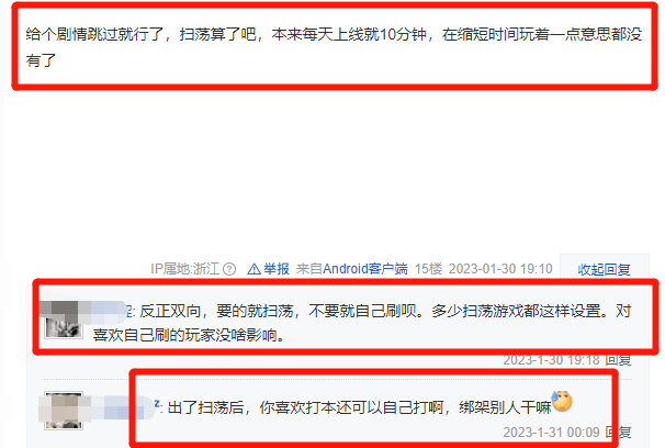 于是持“开启扫荡”的玩家却直言:“你可以不用”。也就是说,喜欢去打副本的,可以不用一键扫荡自己去打,而不喜欢的,则直接一键扫荡跳过。因为剧情不能跳过,可以说是制作剧情需要成本,但副本什么的,似乎真的没有这个必要,不知道大家如何看待呢?