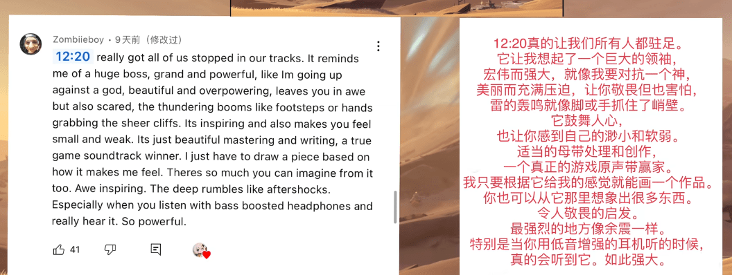 当然,部分玩家体验游戏的时候还是专注于任务和玩法。所以可能不会对这种临场感有太多记忆。但从很多玩家的评论中都能看出,在游戏之外去感受原声带也是非常重要的。当你完全沉浸在音乐里时,就能回味起游戏里的诸多细节,以及曾经被忽略掉的情感。