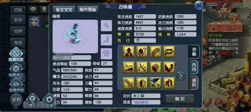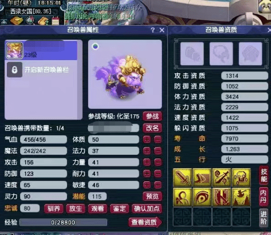 而号主在给另外一只召唤兽打特殊技能力劈时,运气则是欠佳,直接打飞观照技能。这下亏掉了几万块胚子钱不说,还亏掉了几万块的兽诀钱,真是元气大伤,现在只能把希望寄托在回炉出极品了。