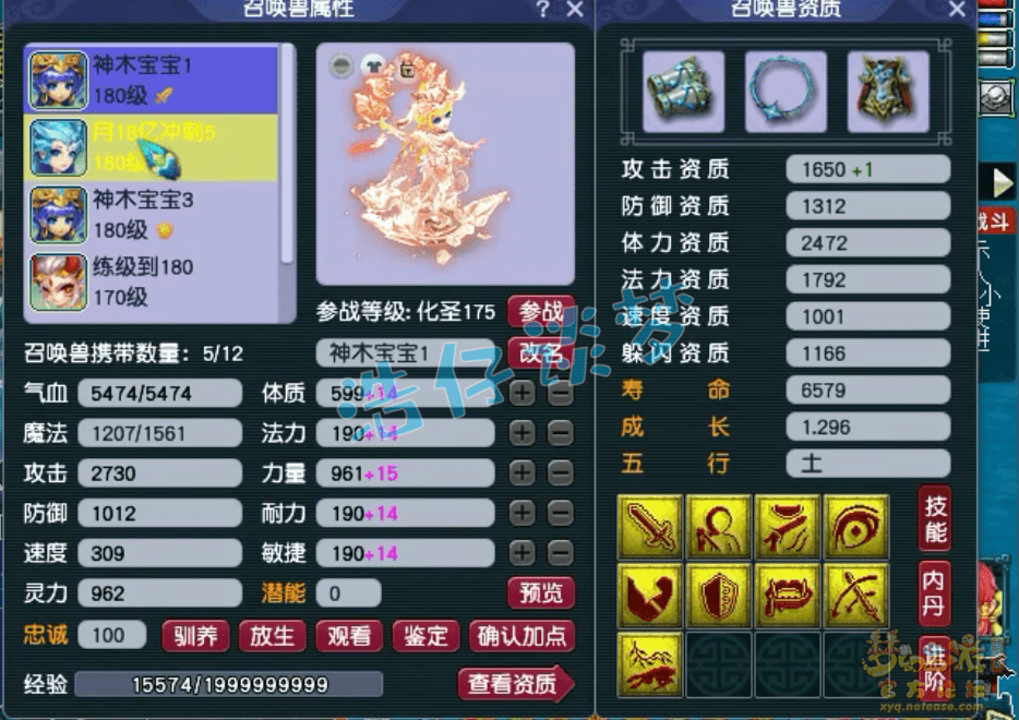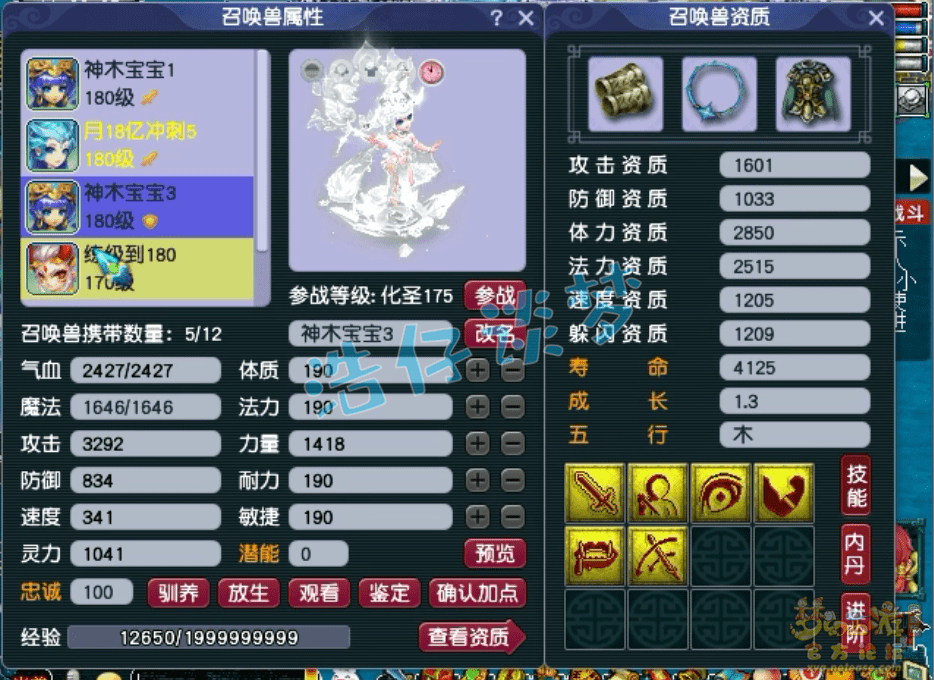 号是175级的神木林,面板属性没有截好图,而且临时符也没有打满,法伤2345不算太高,因为他带的是六法暴灵饰,速度716在各种任务中都能优先出手。