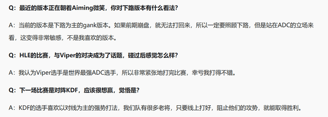 Aiming在随队击败HLE后,在接受采访时也是谈到了对线Viper的感受,并且给对方极高的评价。Aiming直言他认为Viper是世界最强的ADC选手,因此他在对线Viper的时候非常紧张,好在他那场比赛扛住了压力打得还不错。