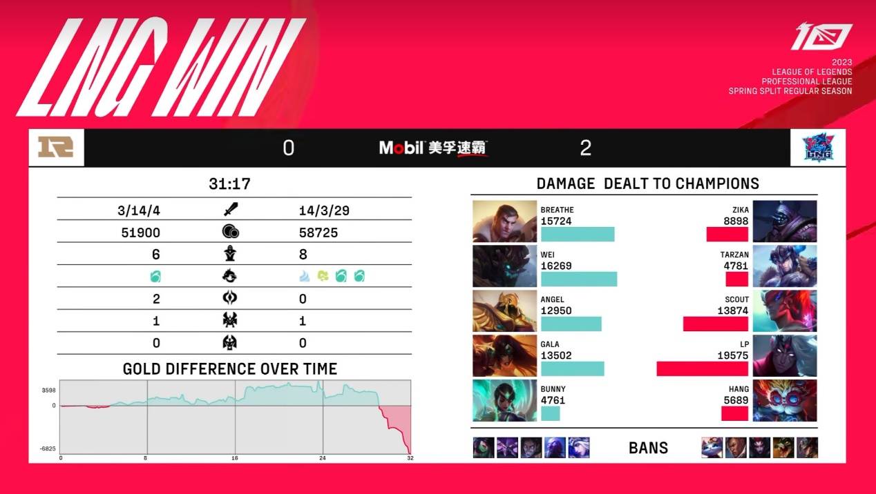 LNG方面则是以一系列联动打赢团战,陷入巨大劣势之后,Angel选择在上路一波加快游戏进程,直接一波抓单反推,然后LNG众人过来砍瓜切菜轻松打赢团战后一波结束比赛。