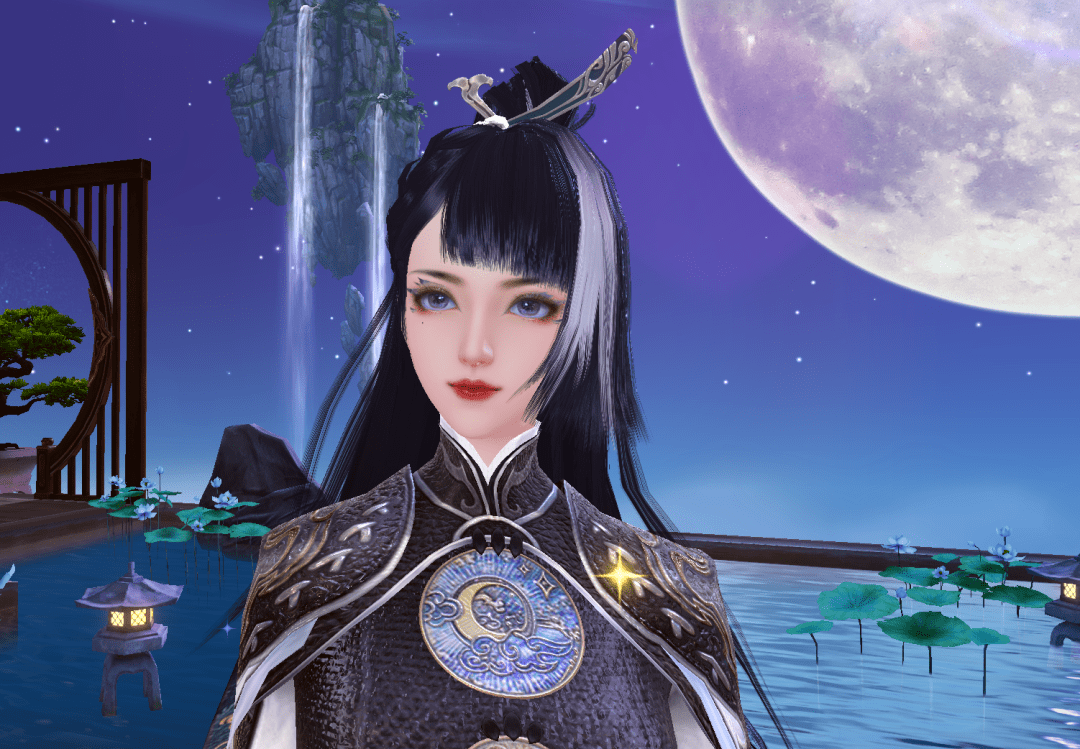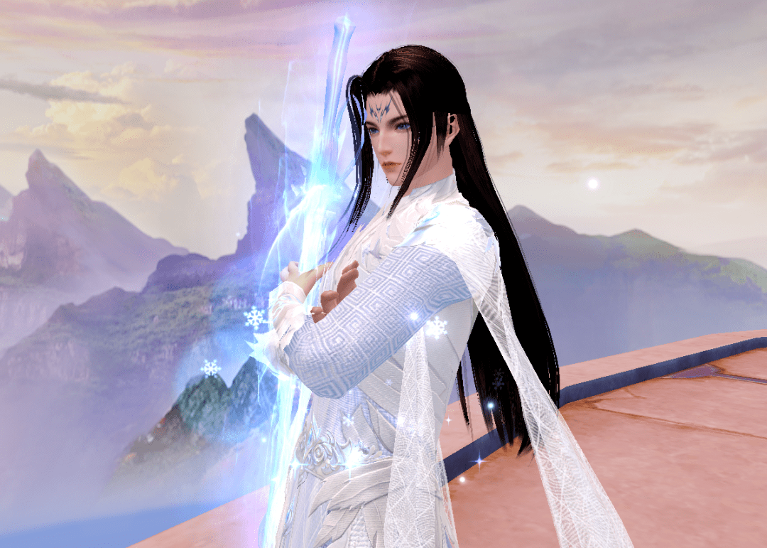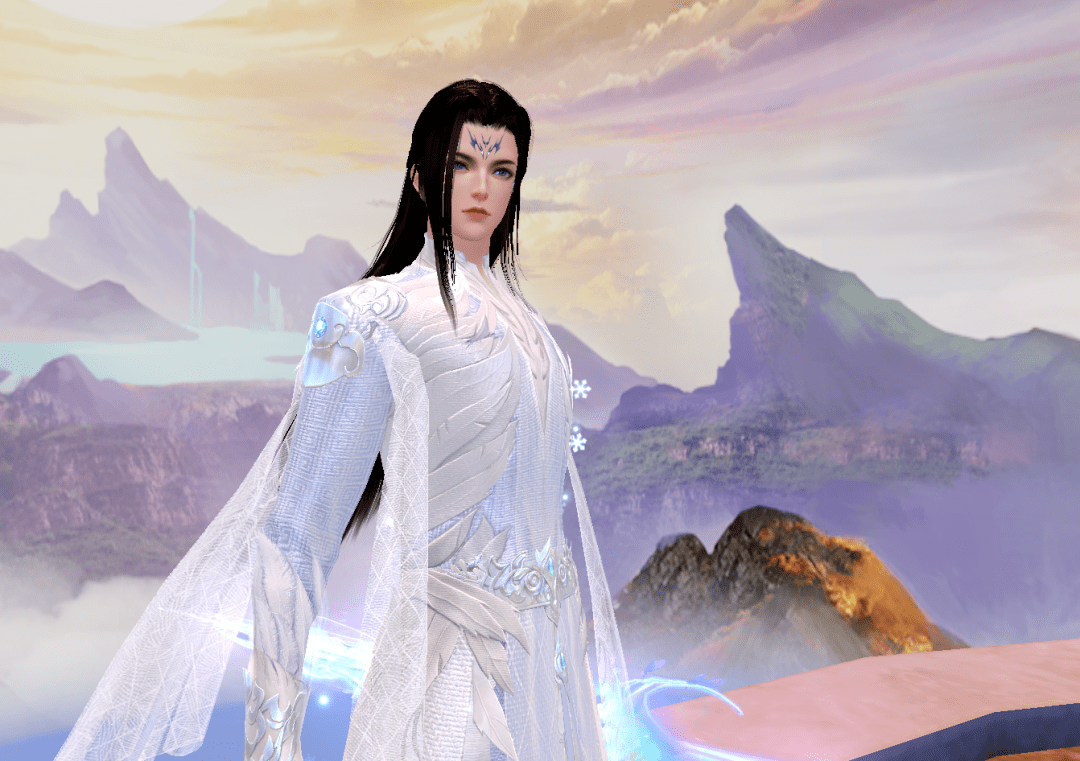 少侠长发飘飘泠然若仙,【月照梨花】的轻羽软甲将他的水色长袍紧紧包裹。抱剑而立的他面容冷峻,一双灰眸如寒潭深井,薄唇紧抿,岿然不动,仿佛时间都与他一起静止了~