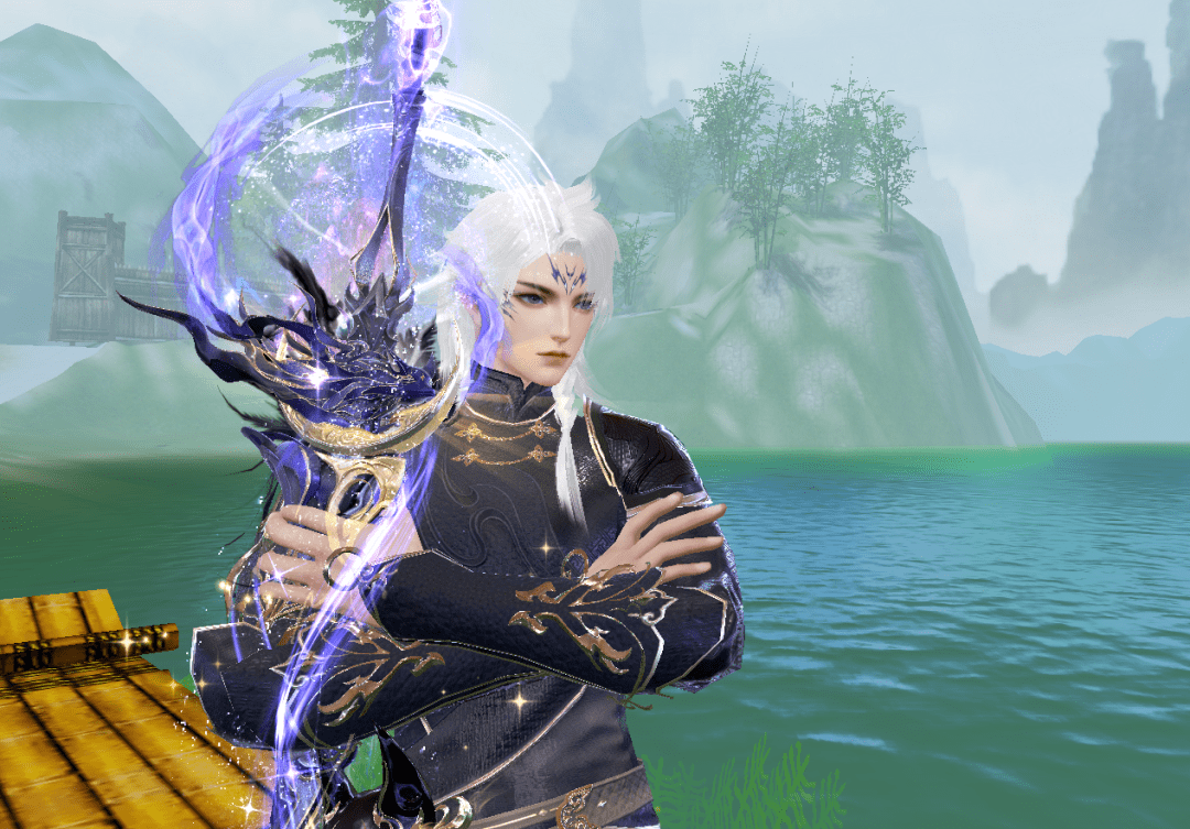 公子一身黑袍泛舟湖上,白发披散,霸气张狂!在额间与颧骨处绘有繁复的神兽图腾,彰显着狂狷之气!