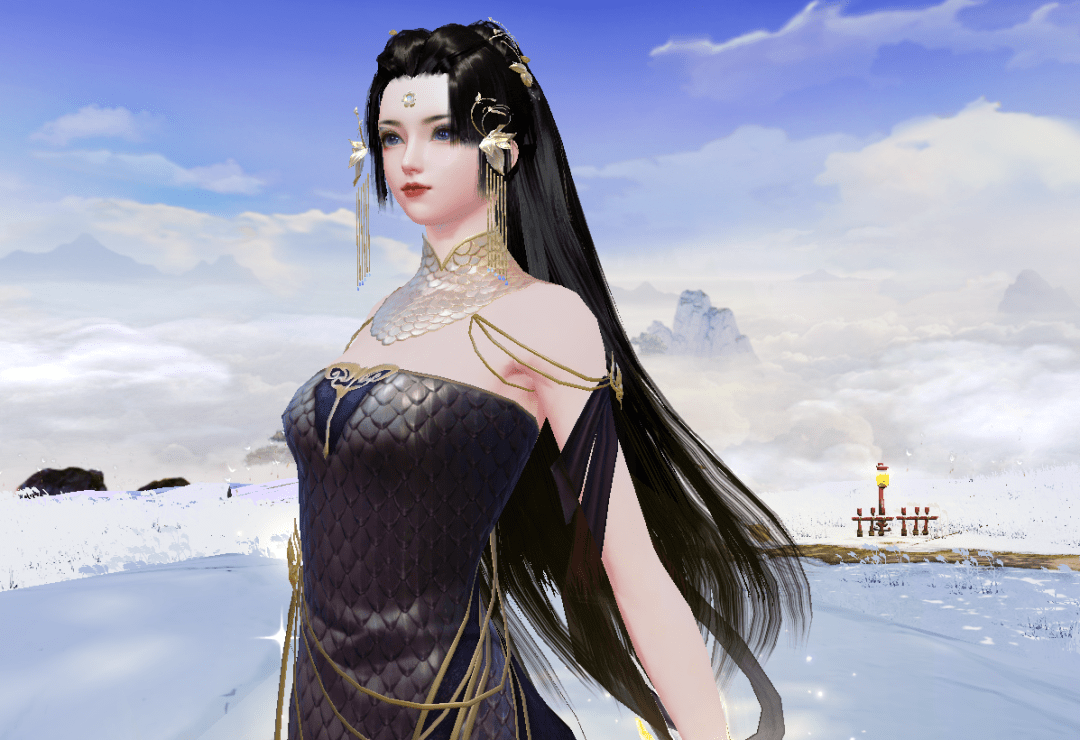 千里冰封,万里飘雪,少女一席黑色长裙宛若雪中精灵。将额间乌发梳起缀上一枚贴花,用金叶装饰的两鬓略微遮掩住眼尾的彩绘,深邃的双目在她舞剑时便焕发出明艳的光彩!