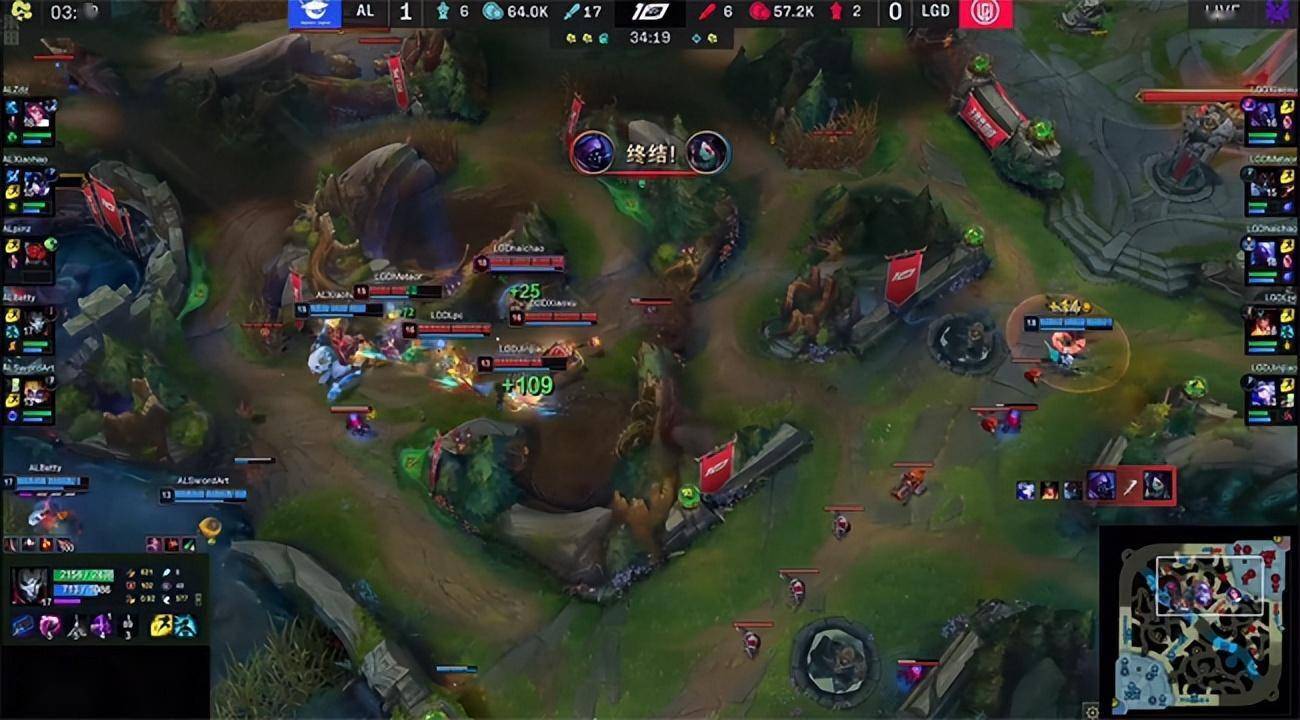 Xiaoxu的贾克斯还想复刻上一场单杀剑姬的场景,不料Xiaohao的猪妹预判到贾克斯的意图,前期直接住在了上路,贾克斯连续阵亡三次发育炸裂。LGD只能控下海克斯小龙,作为交换AL拿到了先锋,撞掉LGD上路一血塔。希维尔和艾希趁机拆了下路一塔勉强止损,随后AL中野双游下路,越塔四包一强杀了孤立无援的艾希。LGD忌惮AL上中野的战力,选择避战发育,AL得以控下水龙加第二只先锋。大龙出生后AL放出先锋吸引LGD的注意力,回身控下小龙并集火带走了大树。