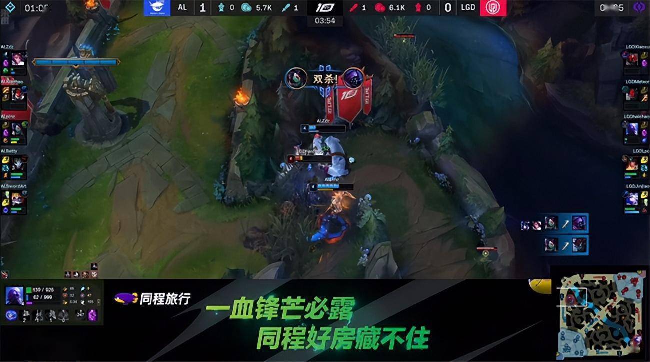 开局LGD下路压线过了河道,猪妹刷到3级绕后gank下路得手,艾希卖自己掩护女警撤退,泽丽拿到一血,这对于女警体系而言不容乐观。
