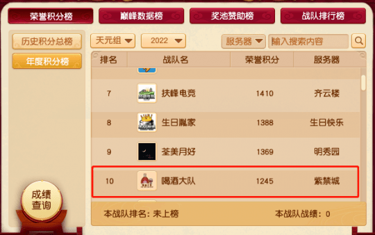近日,梦幻西游群雄逐鹿冠军杯比赛开启报名,每个组别只有达到全服前8名才有资格参赛。由于紫禁城服战队所在的喝酒大队成绩不佳,所以想要参赛只能看前面战队的脸色。不过,随着齐云楼战队的调整和荃美月好的解散,喝酒大队也成功从第10顺位到了第8,拿到了参赛名额。这波,只能说是柳暗花明又一村!
