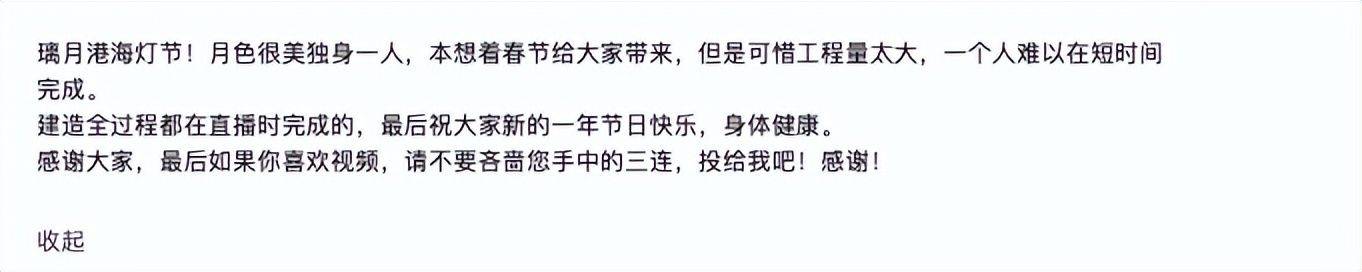 分享出该视频的玩家也提到了,搭建璃月港海灯节花费了他3年的时间,而且由于工程量实在太大,他原计划是春节呈现给大家的,但没能赶上。