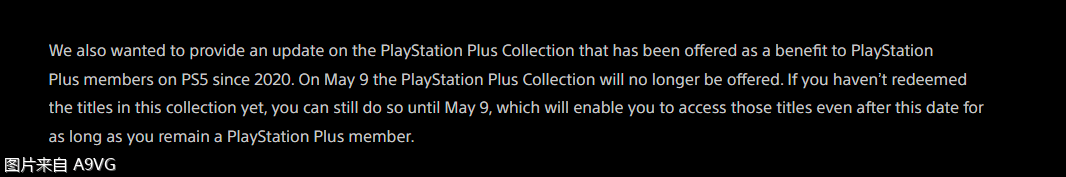 另外,SIE通过PS官方博客透露PS Plus精选集服务将在5月9日停止提供,在此之前还未领取精选集中多款作品的玩家可在截止日期前在PS5主机上进行领取。领取之后,拥有PS+会员资格的用户可以继续游玩这些游戏。